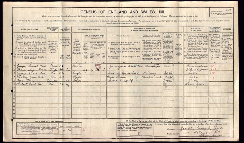 Joseph Samuel Ford, aged 51 years, working as a Journeyman Brass Polisher at a Plumber's Brass WorksMarianette Ford, wife, aged 52 years, married 29 years, had given birth to 9 children, 6 of whom were living and 3 of whom were deadGeorge Dixie Ford, son, aged 24 years, single, working as a Railway Engine StokerStanley James Ford, son, aged 230 years, single, working as a Brass Polisher at a Pumber's worksElla Ford, daughter, aged 18 years, single, working as a daily ServantHerbert Cyril Ford, son, aged 14 years