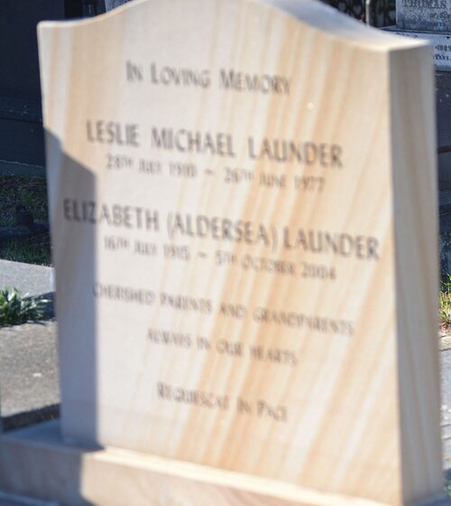 Leslie Michael LaunderBirth 1910, ArmadaleMarriage 1949Spouse Elizabeth AlderseaOccupation Brewery Worker, ClerkResidence 1903-1949 166 Lord Street, RichmondDeath 1977, aged 67 yearsBurial Boroondara Cemetery, Kew, VictoriaChildren 1 Colleen Launder2 Leslie Launder