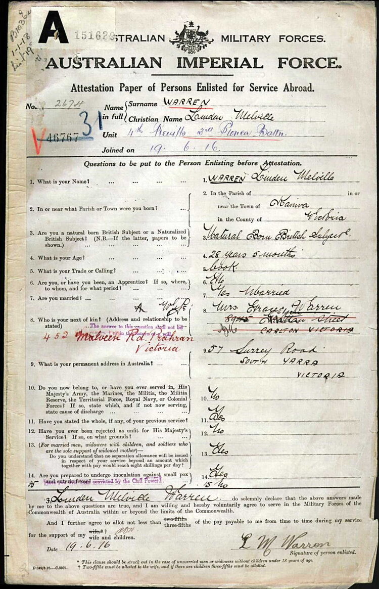 Linden applied for military service on June 5, 1916 and gave his occupation as chef and his current address as 57 Surrey Road, South Yarra. His military application showed Linden was 28 years and 5 months old at time of application, was 5 feet 5 inches tall, weighed 129 pounds. He had a fresh complexion, blue eyes, light brown hair, freckled arms and a birthmark in the small of his back.