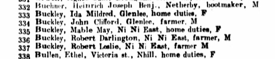 ROBERT DARLINGTON BUCKLEY (JNR) Birth 1870, June 19 Merino Downs, Victoria Father Robert Darlington Buckley Snr Born 1833 in Ireland Died June 22, 1919 at Lawloit, aged 86 years He had lived in the district since 1880Obituary reads “He was a fine type of man, splendid judge of cattle, and an excellent agriculturist.” His Will dated March 6, 1917 left estate of £2,487 to his children Mother Mary Elizabeth Hicks Robert Darlington Buckley Snr and Mary Hicks married 1856, July 10 in Portland,Victoria Death 1948 (77 years) Warrnambool, Victoria Siblings 1857-…. Francis Buckley married Sarah Martin 1859-…. John Buckley married Cath Cecelia Bruder 1860-…. Ellen Buckley married John Grey 1862-…. Benjamin (AKA Alfred) Buckley married Susan White, married Louisa Gange 1866-…. Mary Jane (aka Polly) Buckley married Jack Justin 1869-…. Catherine (aka Kate) Buckley married William Parkin |