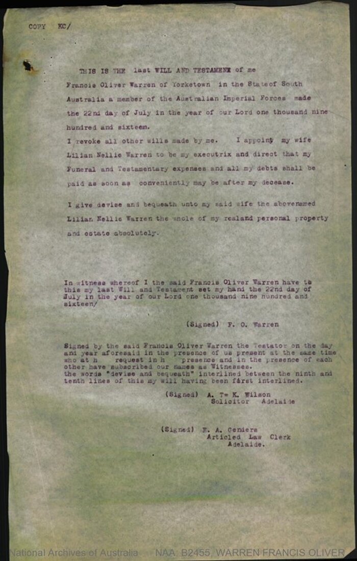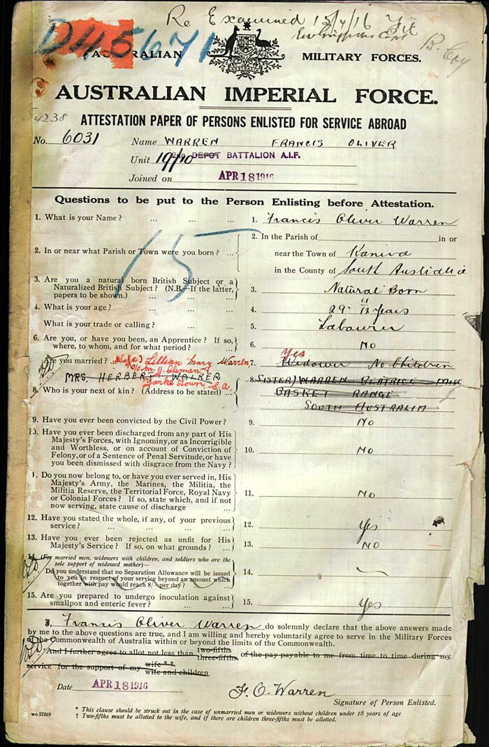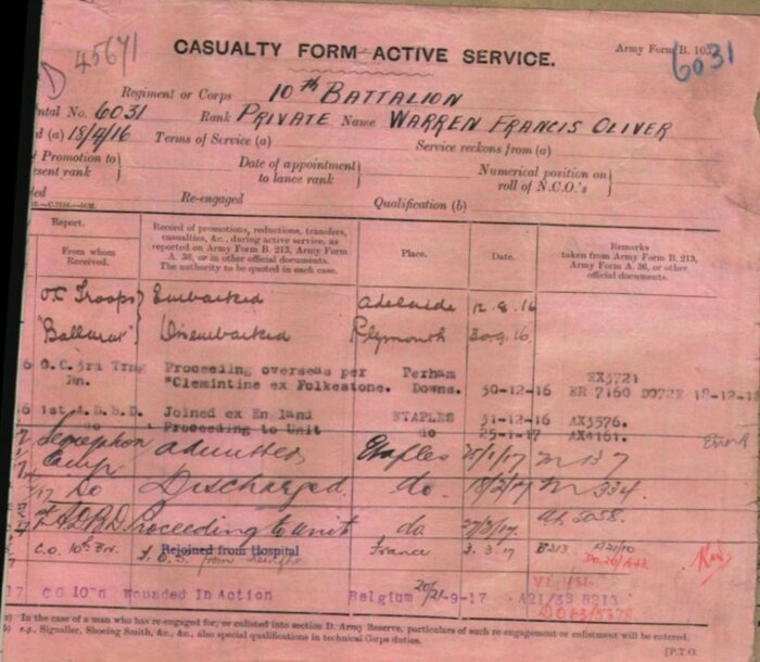Private Francis Oliver Warren left Australia in August 1916, arriving in Plymouth, England at the end of September that year. It’s difficult to decipher, but it appears he may have been admitted to hospital in Naples in January 1917, discharged in February 1917, then sent to his unit in France in March, 1917.