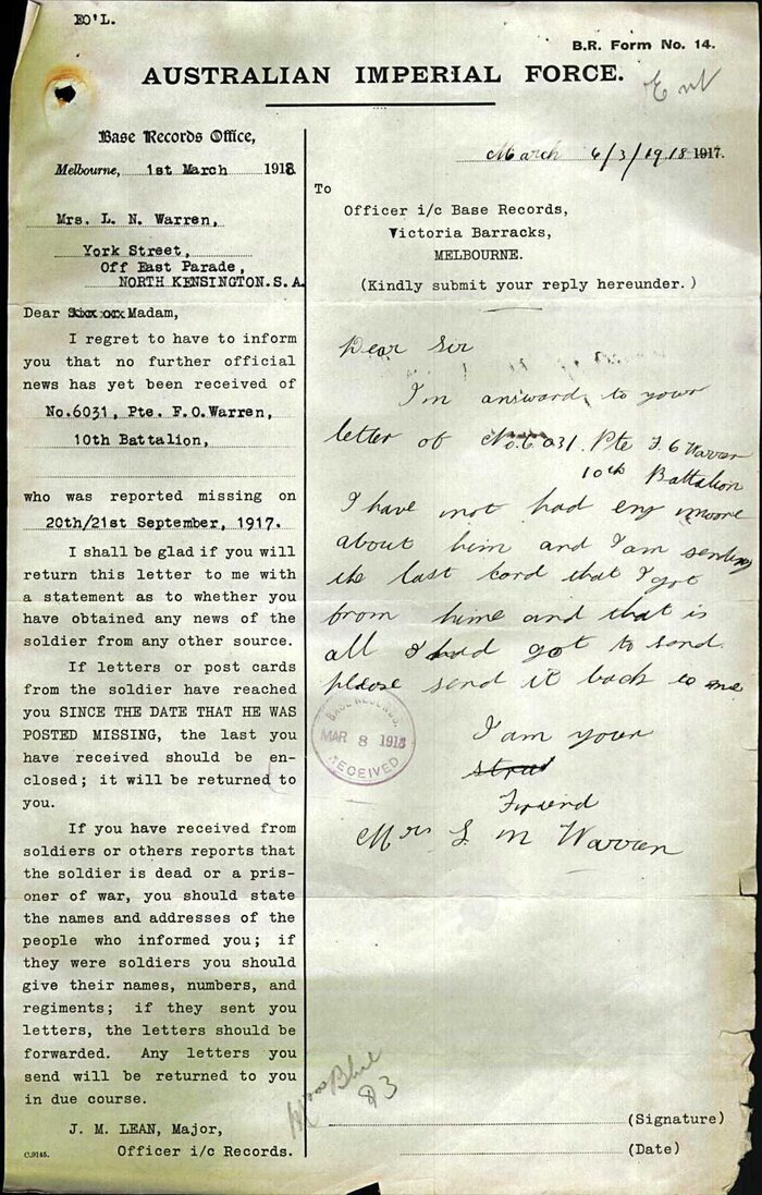 1917 – September 17 – Francis Oliver Warren is Missing in Action