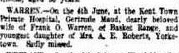 1914 – Gertrude Maude Warren, nee Roberts – Death