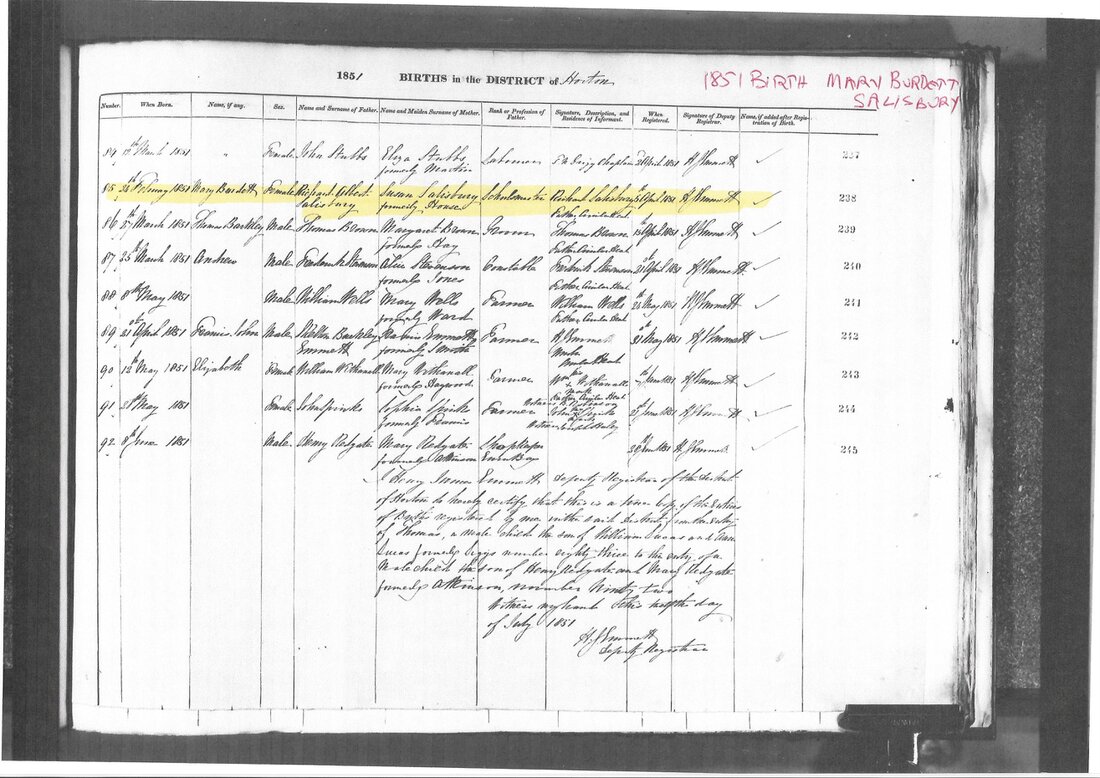The second child and sister to Mary Burdett arrived on September 2, in 1853 whom they named Ellen Burdett. She was born at the Crown Hotel and Richard signed the registration for the birth as ‘R. B. Salisbury, B.A.’ with a flamboyant flourish!