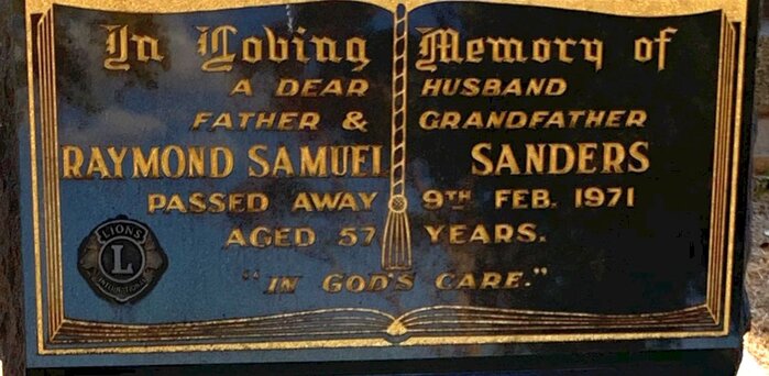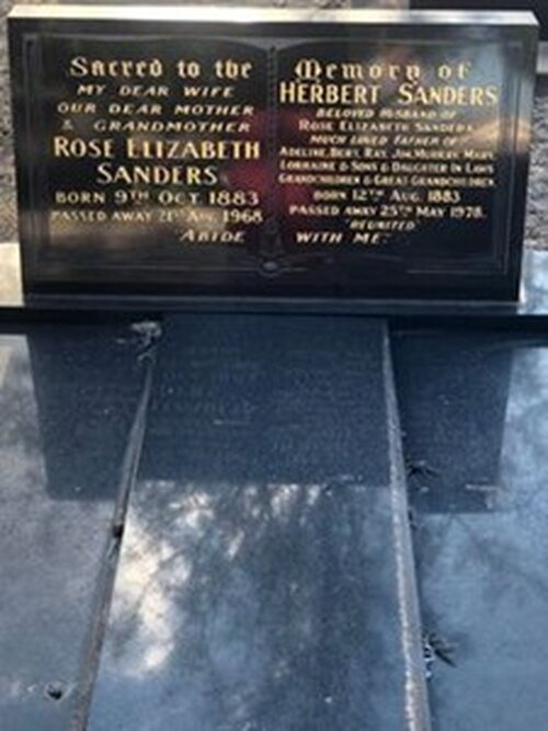 Children1 Elizabeth Sanders (1909-1909)2 Adeline Charlotte Sanders (1910 -1991).3 Herbert Warren Sanders (1911 -<1997)4 Raymond Samuel Sanders (1913 – 1971)5 Harold Jim Sanders (1915 - )6 Murray Colin Sanders (1917 - 1984)7 Mary Rose Sanders (1919 - ).8 Stanley Malcolm Sanders (1925 – 1925).9 Lorraine Edith Sanders (1928 – )