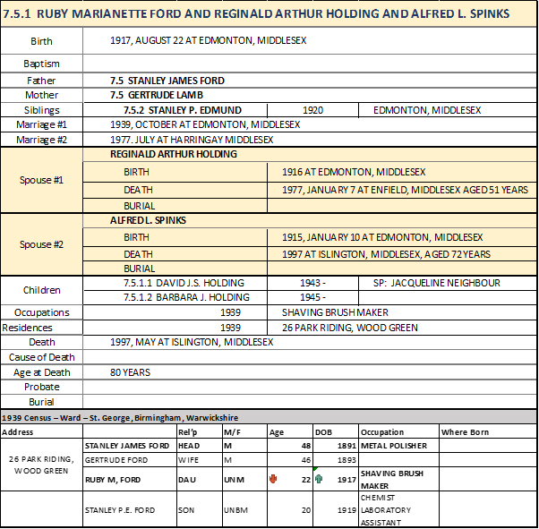 Name: Ruby M FordRegistration Date: Oct 1939[Nov 1939][Dec 1939]Registration Quarter: Oct-Nov-DecRegistration district: EdmontonInferred County: EssexSpouse: Reginald A HoldingVolume Number: 3aPage Number: 3609Marriage Registration for Ruby Marionette Ford (Ancestry.com. England & Wales, Civil Registration Marriage Index, 1916-2005)