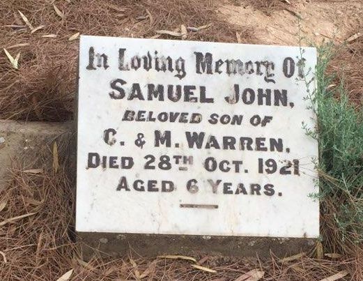 Name: Samuel John WarrenDeath Date: 28 Oct 1921Cemetery: Pinnaroo CemeteryBurial or Cremation Place: Pinnaroo, Southern Mallee District Council, South AustAncestry.com. Australia and New Zealand, Find A Grave Index, 1800s-Current1921 Samuel John Warren Headstone