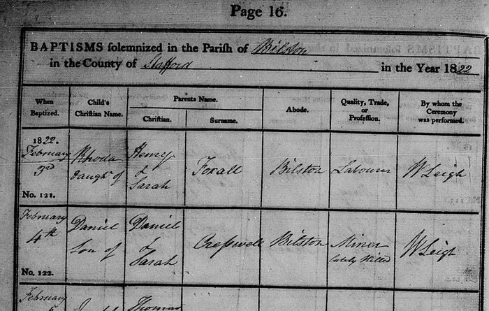 Baptised 1822, February 4 at St. Leonard's Church, Bilston (Father had died just recently)