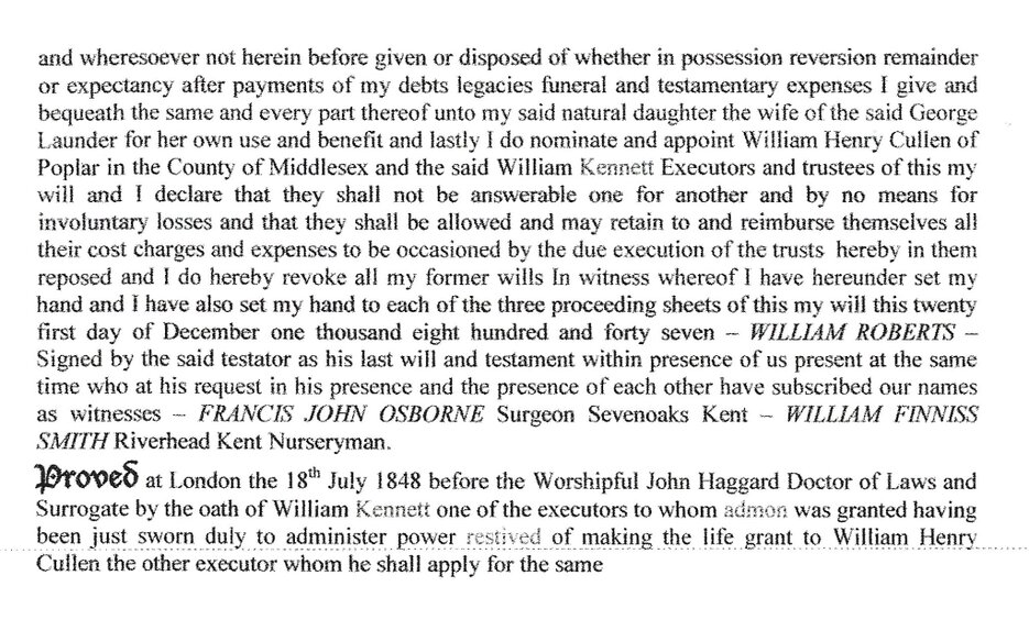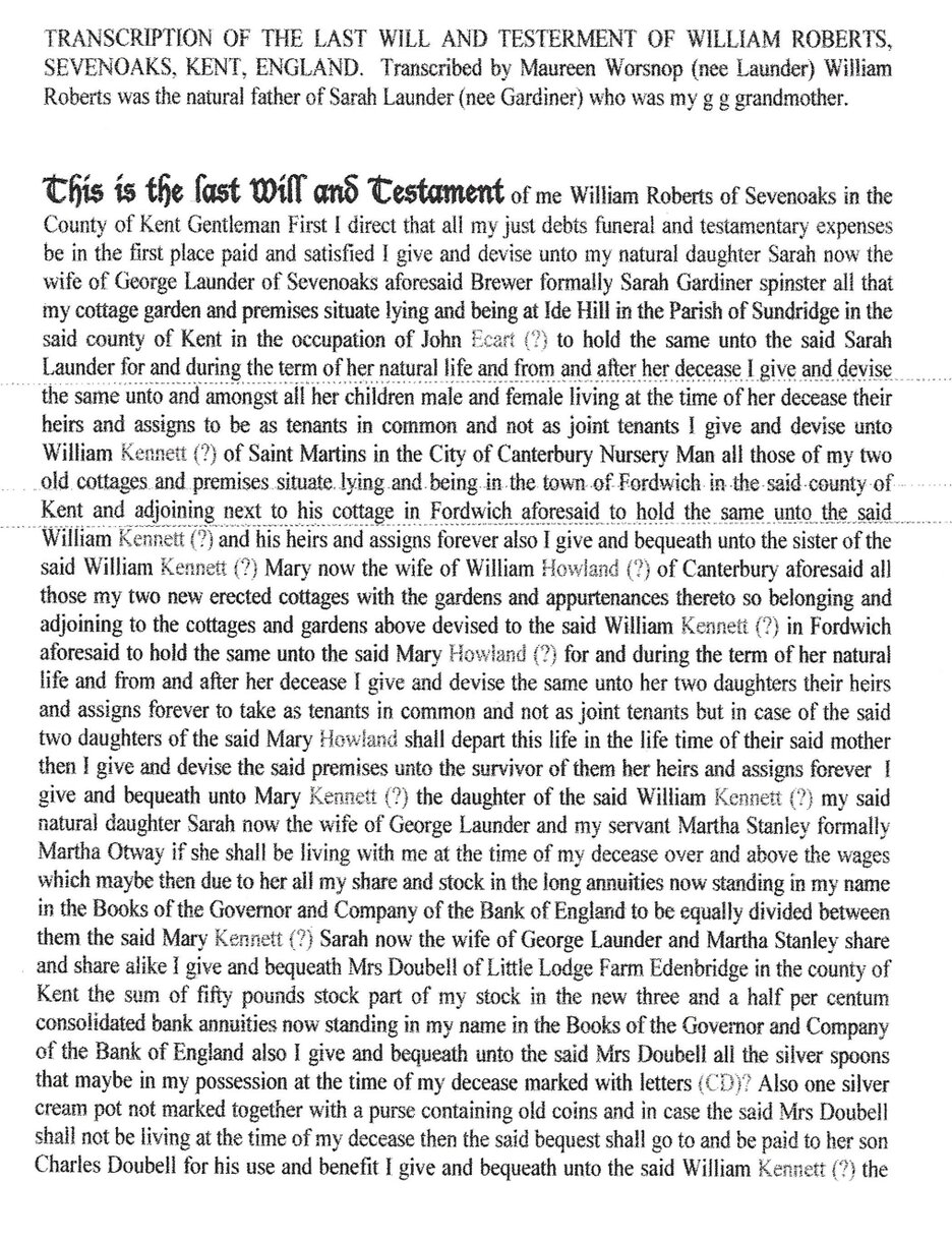 Sarah grew up in Sevenoaks, and it can be assumed that she had contact with her biological father, William Roberts, because before he died, he wrote a will which acknowledged Sarah as his natural daughter and included a substantial entitlement to her. It was possibly under his influence that Sarah gained a good education – there were good schools in the area at that time.
