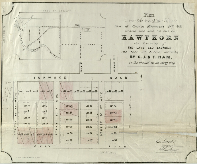 George Launder Jnr. now a qualified surveyor, drew up the plans for the subdivision of the Launder Paddock and in 1877, the land in Hawthorn bounded by Burwood Road and Oxley Road was advertised for sale. The land had been divided into 46 separate building allotments, each of which was available for sale.