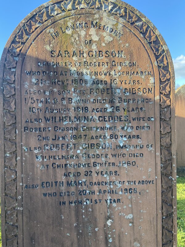 Headstone Transcription -In loving memory of Sarah Gibson, daughter of Robert Gibson, who died at Moss Knowe, Lochmaben, 21st November, 1906 aged 16 yearsAlso his son, Pte. Robert Gibson 1/5th K.OS.B. who died at Burrance, 20 August, 1918 aged 26 yearsAlso Wilhelmina Geddes, wife of Robert Gibson Chirknowe, who died 2nd January 1947, aged 80 yearsAlso Robert Gibson husband of Wilhelmina Geddes who died at Chirknowe, 6th February, 1960, aged 92 yearsAlso Edith , daughter of above, who died 20 April 1906 in her 21st year.