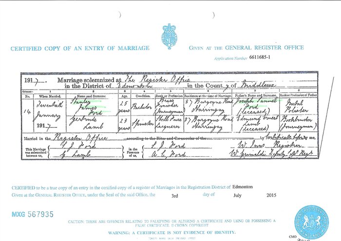 The marriage certificate, shows Stanley and Gertrude were married at The Registry Office in Edmonton, Middlesex on January 20th, 1917. Stanley, aged 25 years was a bachelor, working as a Brass Finisher Journeyman. His father, Joseph Samuel was deceased.