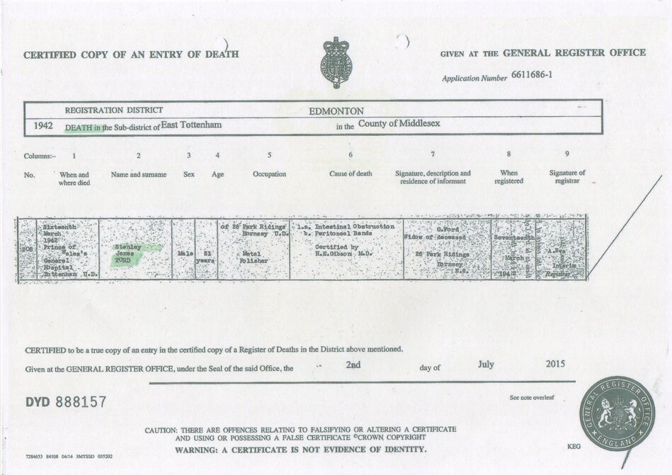 Stanley died at the relatively young age of 51 years. At the time of his death, he had been living at 26 Park Ridings in Hornsey in Middlesex and working as a metal polisher. He died on March 16 in 1942 at the Prince of Wales General Hospital in Tottenham.