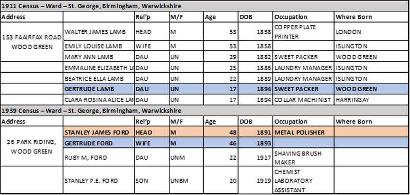 Name R’ship Age Occupation Birth PlaceWalter James Lamb Father 53 years Copper Plate Printer LondonEmily Louise Lamb Wife 53 years IslingtonMary Ann Lamb Dau 29 years Sweet Packer Wood GreenEmaline Elizabeth Lamb Dau 25 years Laundry Manager IslingtonBeatrice Ellen Lamb Dau 22 years Laundry Manager IslingtonGertrude Lamb Dau 17 years Sweet Packer Wood GreenClara Rosina Alice Lamb Dau 17 years Collar Machinist Harringay