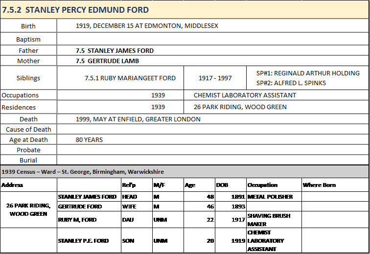 Name: Stanley Edmund FordDeath Age: 79Birth Date: 15 Dec 1919Registration Date: May 1999Registration district: EnfieldInferred County: Greater LondonRegister Number: A37DDistrict and Subdistrict: 2271AEntry Number: 75Ancestry.com. England & Wales, Civil Registration Death Index, 1916-2007