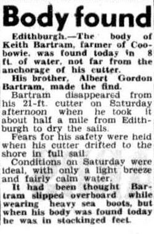 Born 1930, January 3 at Yorketown, SAFather Albert Gordon (Johnnie) BartramMother Thelma Rose ShortDied 1941, August 9Age 11 yearsCause of Death Tetanus after accident with chainsaw1941 - COOBOWIE - FATAL ACCIDENT. Arm Severed by Circular SawReccntlv, Graham, the 11-year-old son of Mr. and Mrs. Bartram, of Coobowie, had his wrist severed by a circular saw. The sufferer was brought to the Yorketown Hospital, where it was found necessary in amputate the hand. Despite every attention, he succumbed to his injuries on Saturday last. Graham, who was 11 years of age, was a quiet and industrious lad, and that he was popular among his school-fellows is demonstrated by the following tribute from his school:—Graham Charles Bartram.Born: April 13th, 1930.Departed this Life: August 9th, 1941.Graham was the soul of honour. In lhis quiet unassuming way he lovingly and patiently fulfilled his daily tasks and duties. Within the school he was ever willing to extend his help to those who needed helping over some lesson problem; left in freedom to make his own educational researches, his honour and industry made him perfectly reliable. In the playing field, he played for his team - never for himsell.On the first page of his broadcast book, which was to record this year's work, he wrote :-