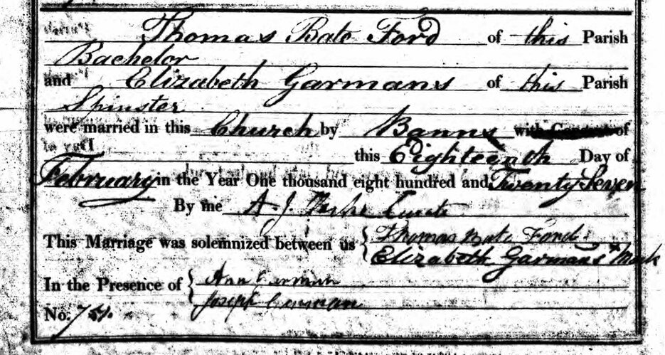 It is often difficult to read the old parish records, but it is without doubt the spelling of Elizabeth’s surname is “Garmans”. Neither party had been previously married. Thomas Bate Ford signed his name to the register, whereas Elizabeth made her mark.