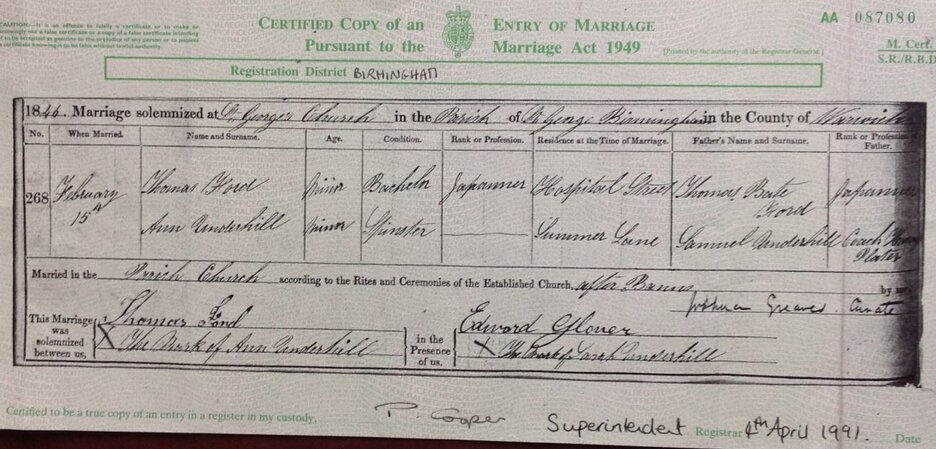 THOMAS BATE FORD Birth 1804 at Bilston, Staffordshire, UK Baptism 1804 December 9 at St. Leonard’s Church in Bilston, Staffordshire Siblings William Ford (1798 - ....) Jacob Ford (C1802 - 1842) Spouse Mary Ann Lester Sarah Ford (C1802 - 1842) Spouse Daniel Cresswell & William Lester Christopher Ford (1807 - 1875) Spouse Phebe Moore Marriage 1827, February 18 at St. Martin’s Church, Birmingham, UK Spouse Elizabeth Garmans Occupation Japanner Residences 1839 - Edgbaston Street, Birmingham 1834 - Hill Street, Birmingham 1841 - New Church Street, Birmingham 1851 - 5 Hospital Street, Birmingham 1848 - 5 Hospital Street, Birmingham Death 1848, January 4 at 5 Hospital Street, Birmingham, UK Cause of Death Phthisis for previous 4 months Age at Death 43 years Burial 1848, January 9 at St. Martin's Church, Birmingham Children 2. Daniel Ford (1828 - 1839) 4. William Ford (1833 - 1834) 7. Jacob Ford (1841 - 1844) |