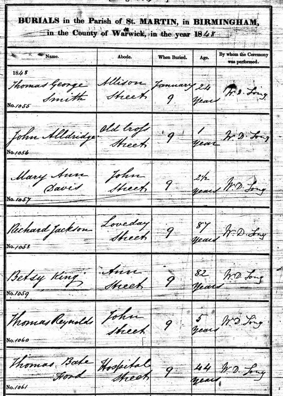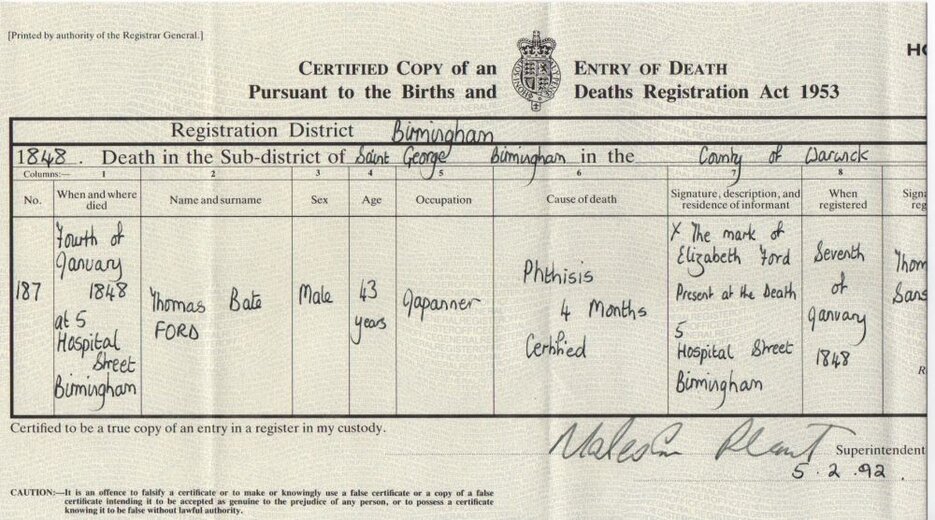 Thomas Bate Ford died on January 4, 1848 at home at 5 Hospital Street, Birmingham