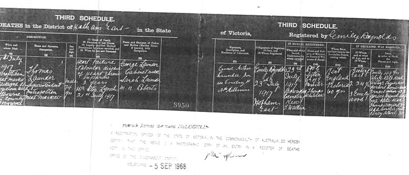 On July 21, 1917 at the Metropolitan Meat Market, Blackwood Street, North Melbourne, where he lived and was employed as the Superintendent of the Meat Market, Thomas Launder died, aged 74 years. The cause of death was heart failure caused by a valvular disease of the heart and chronic nephritis which he had suffered for the previous three years.