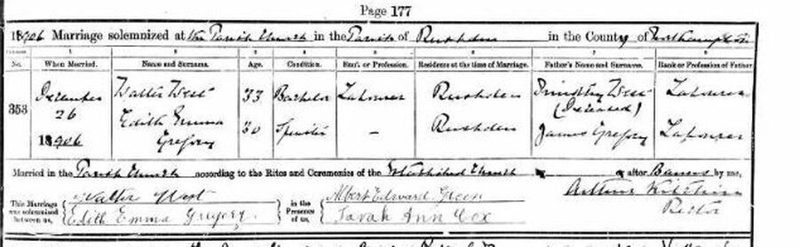 Born 1876 at Clifton, BedfordshireBaptism 1876, February 9 at Clifton, BedfordshireFather Timothy WestMother Mary Ann WiltonMarriage 1906, December 26 at Rushden, East NorthamptonshireSpouse Edith Emma Gregory (C1876 - 1957)Death 1932, March 28 at NorthamptonshireAge at Death 56 yearsBurial 1932, March 31 Newton Road. Cemetery, Rushden, East NorthamptonshireChildren - 1. Gladys Gertrude Gregory