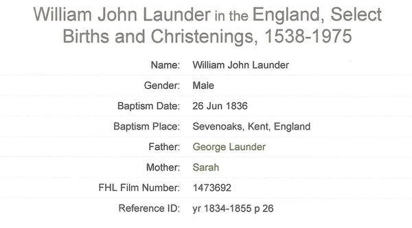 William John Launder was the second born child and first son of George William Launder and Sarah Gardiner. He was born at Sevenoaks, in Kent in 1836 on May 24 and baptised a month later.