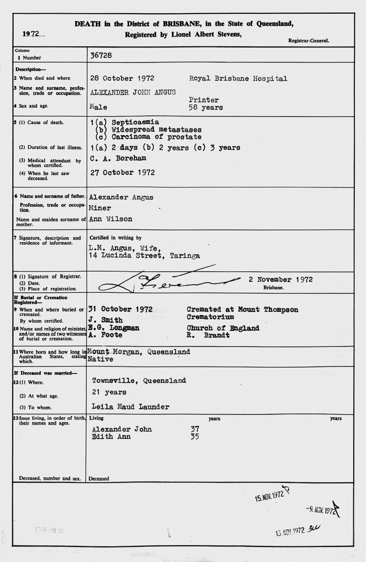 Birth 1914, April 25 at Mt. Morgan, QueenslandFather Alexander John AngusMother Ann WilsonOccupation PrinterDeath 1972, October 28 at Royal Brisbane HospitalCremated Mt. Thompson Crematorium.