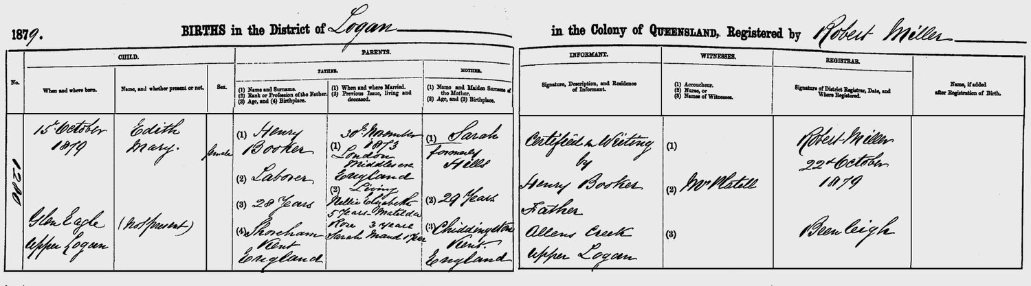 Edith was born on October 15 in 1879 at Glen Eagle, Upper Logan, Queensland. Her father was Henry Booker, a labourer, aged 28 years, born in Shoreham, Kent, England. Her mother was Sarah Hills (or Mills), 29 years, born at Chiddington, Kent. The birth had been notified to the BDM Office in writing by Edith's father who lived at Allens Creek in Upper Logan. Edith's parents has married on November 30 in 1873 in London, England. They already had 3 other children - Nellie Elizabeth, 5 years, Matilda Rose, 3 years and Sarah Maud 1 year.