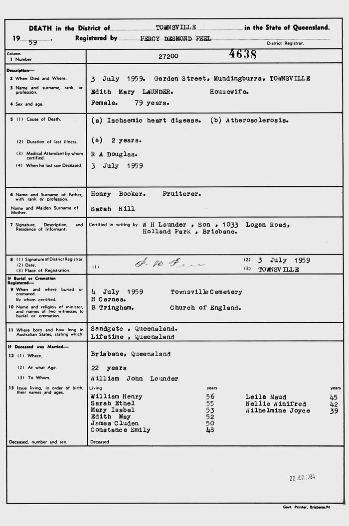 Edith died at age 79 years on July 3 in 1959 at Garden Street, Mundingburra, Townsville. She had been unwell for the previous two years. The informant was her son, William Henry Launder of 1033 Logan Road, Holland Park, Brisbane. Edith was buried on July 3 at the Townsville Cemetery in the Church of England section.