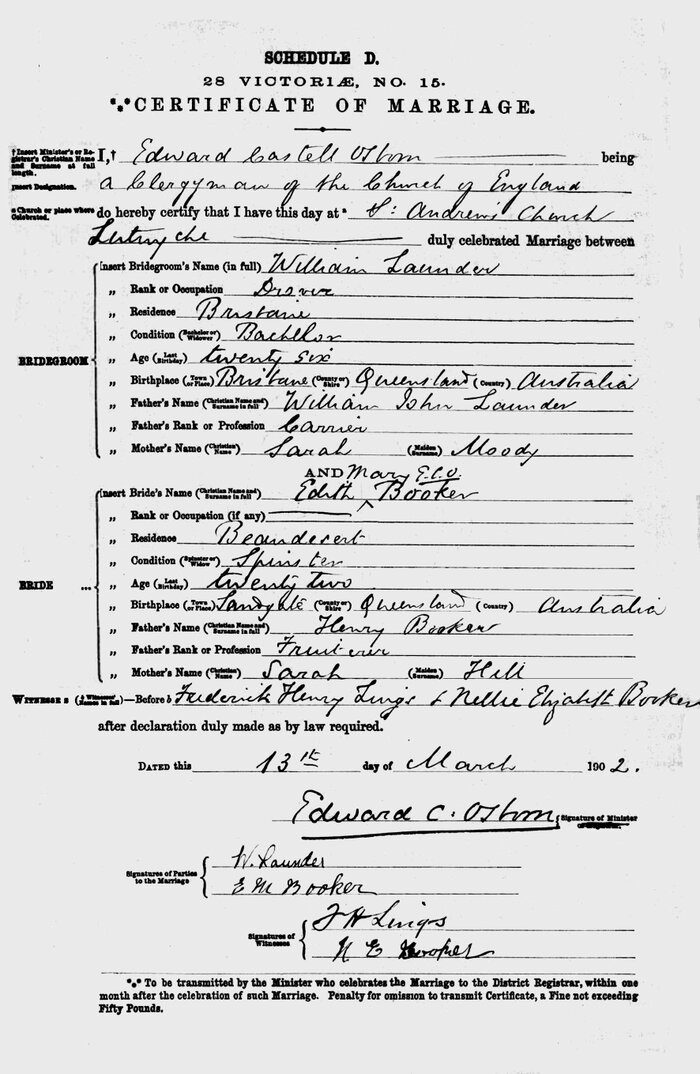 William John LaunderBirth 1875. June 8 at Leaning Apple Tree Station in QueenslandMarriage 1902, March 13 in QueenslandSpouse Edith May Booker