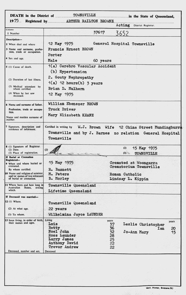 Birth 1914, December 21 at Townsville, QueenslandFather William Ebenezer BrownMother Mary Elizabeth KeaneDeath 1975, May 12Age at Death 61 yearsCremated Woongarra Crematorium, Townsville