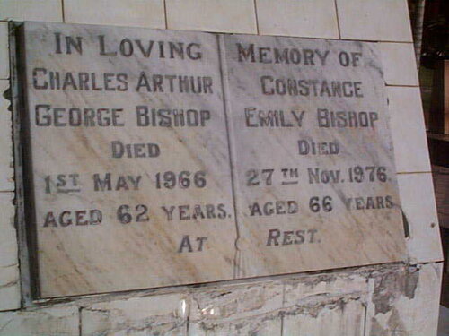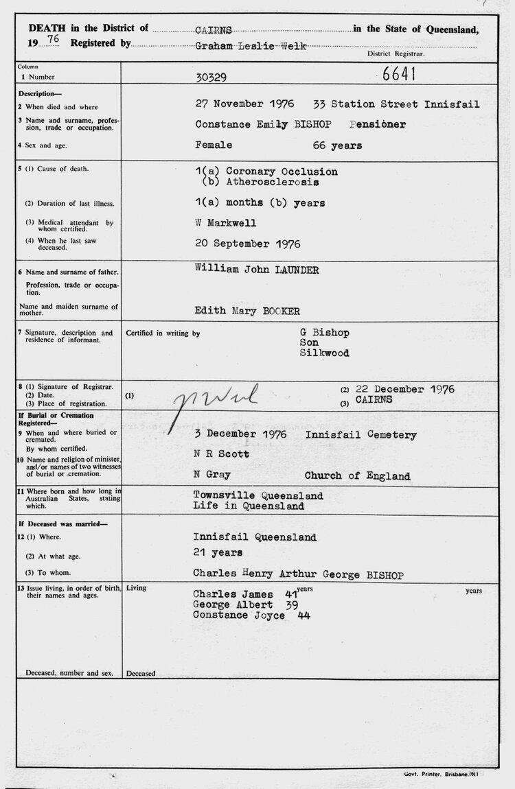 Constance died, aged 66 years at home at 33 Station Street, Innisfail in North Queensland. Her son, G. Bishop of Silkwood, was the informant of her death. She was buried on December 3 in 1976 at the Innisfail Cemetery. She had been married to Charles Bishop for 21 years, and left three adult children.Name: Constance Emily BishopDeath Date: 27 Nov 1976Cemetery: Innisfail CemeteryBurial or Cremation Place: Innisfail, Cassowary Coast Region, Queensland, AustraliaAncestry.com. Australia and New Zealand, Find a Grave Index, 1800s-Current