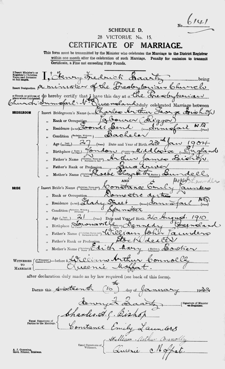 Charles Arthur George Bishop, bachelor, occupation Rigger, bachelor, living at Innisfail, North Queensland, aged 27 years, born January 23, 1904 married Constance Emily Launder at the Presbyterian Church in Innisfail. Charles' father was Arthur James Bishop, a bus driver and his mother was Phoebe Elizabeth Brundell.