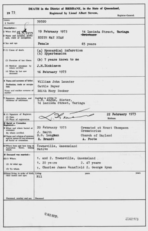 Born 1907Father William John LaunderMother Edith May BookerSpouse #1 1928, Charles James MansfieldSpouse # 2 S RyanDeath 1973 in Townsville, Q’land, Age 66 years