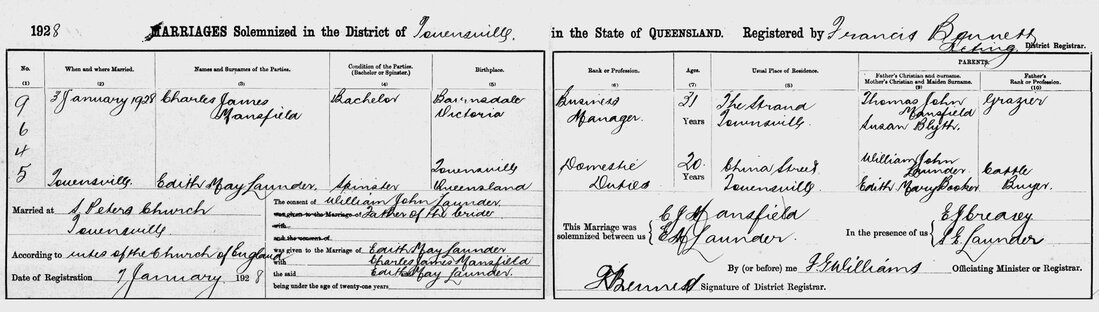 1932 - Marriage, Daughter, Constance Emily LaunderName: Edith May LaunderSpouse Name: Charles James MansfieldMarriage Date: 03 Jan 1928Marriage Place: QueenslandRegistration Place: QueenslandRegistration Year: 1928Registration Number: 000843Page Number: 2291Ancestry.com. Australia, Marriage Index, 1788-1950
