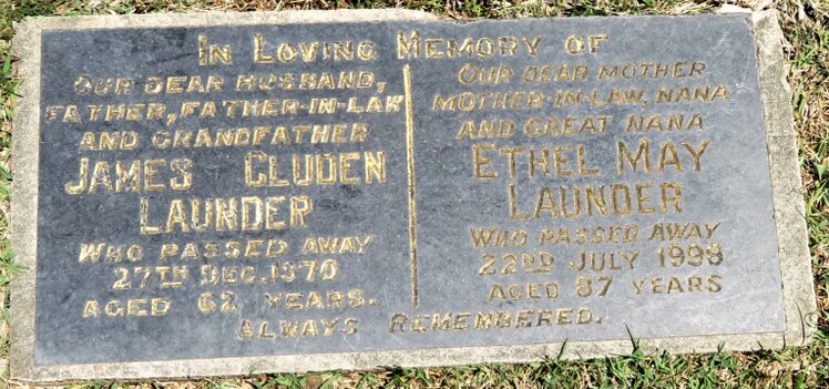 1998 - Death, Ethel May Launder, nee StonehamName: James Cluden LaunderBirth Date: 13 Dec 1908Birth Place: Queensland, AustraliaDeath Date: 27 Dec 1970Death Place: Queensland, AustraliaCemetery: Mount Bassett CemeteryBurial or Cremation Place: Mackay, Mackay Region, Queensland, AustraliaSpouse: Ethel May LaunderAncestry.com. Australia and New Zealand, Find a Grave Index, 1800