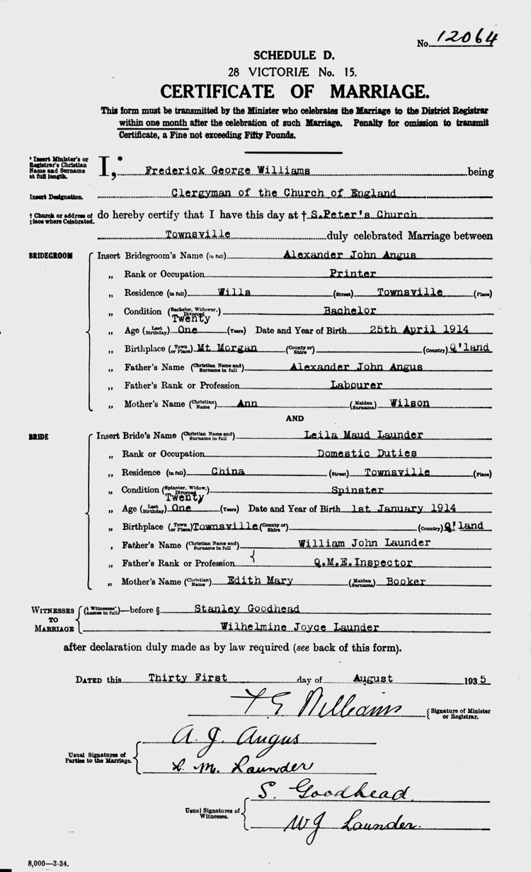 Name: Leila Maud LaunderSpouse Name: Alexander John AngusMarriage Date: 31 Aug 1935Marriage Place: QueenslandRegistration Place: QueenslandRegistration Year: 1935Ancestry.com. Australia, Marriage Index, 1788-1950