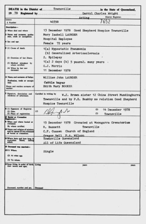 Born 1906, January 10 in QueenslandFather William John LaunderMother Edith May BookerDeath 1978, December 13 in Townsville, QueenslandAge at Death 72 yearsCremation Woongarra Crematorium, Townsville