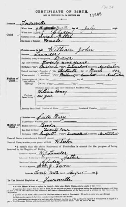 Name: Sarah Ethel LaunderBirth Date: 4 Jul 1904Birth Place: QueenslandRegistration Year: 1904Registration Place: Queensland, AustraliaFather: William John LaunderMother: Edith Mary BookerAncestry.com. Australia, Birth Index, 1788-1922