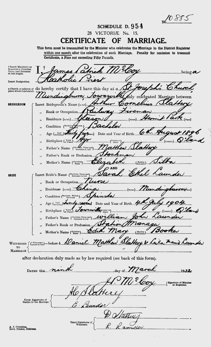 Name: Sarah Ethel LaunderSpouse Name: Arthur Cornelius SlatteryMarriage Date: 09 Mar 1932Registration Place: QueenslandRegistration Year: 1932Ancestry.com. Australia, Marriage Index, 1788-1950Sarah Ethel Launder and Arthur Slattery