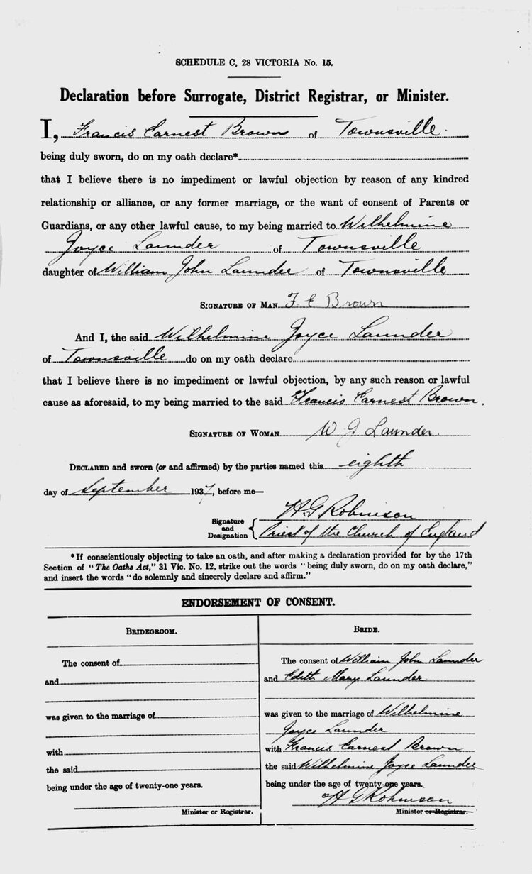 On September 11 in 1937, Wilhelmina married Francis Ernest Brown. Francis was a taxi driver and lived at 61 China Street in Mundingburra. He was a bachelor of 22 years. Wilhelmina was 17 years old and lived just down the street from Francis at 54 China Street. She worked as a shop assistant. Her father, William John Launder was a cattle buyer, but it seems he may not have attended the marriage as he did not sign as a witness to the marriage.,