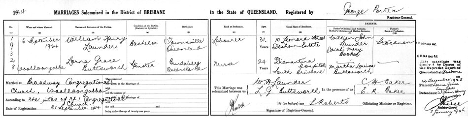 The marriage of William Henry Launder and Lorna Grace Buttsworth was dissolved by Decree of the Supreme Court of Briosbane, Queensland on December 12, 1945.