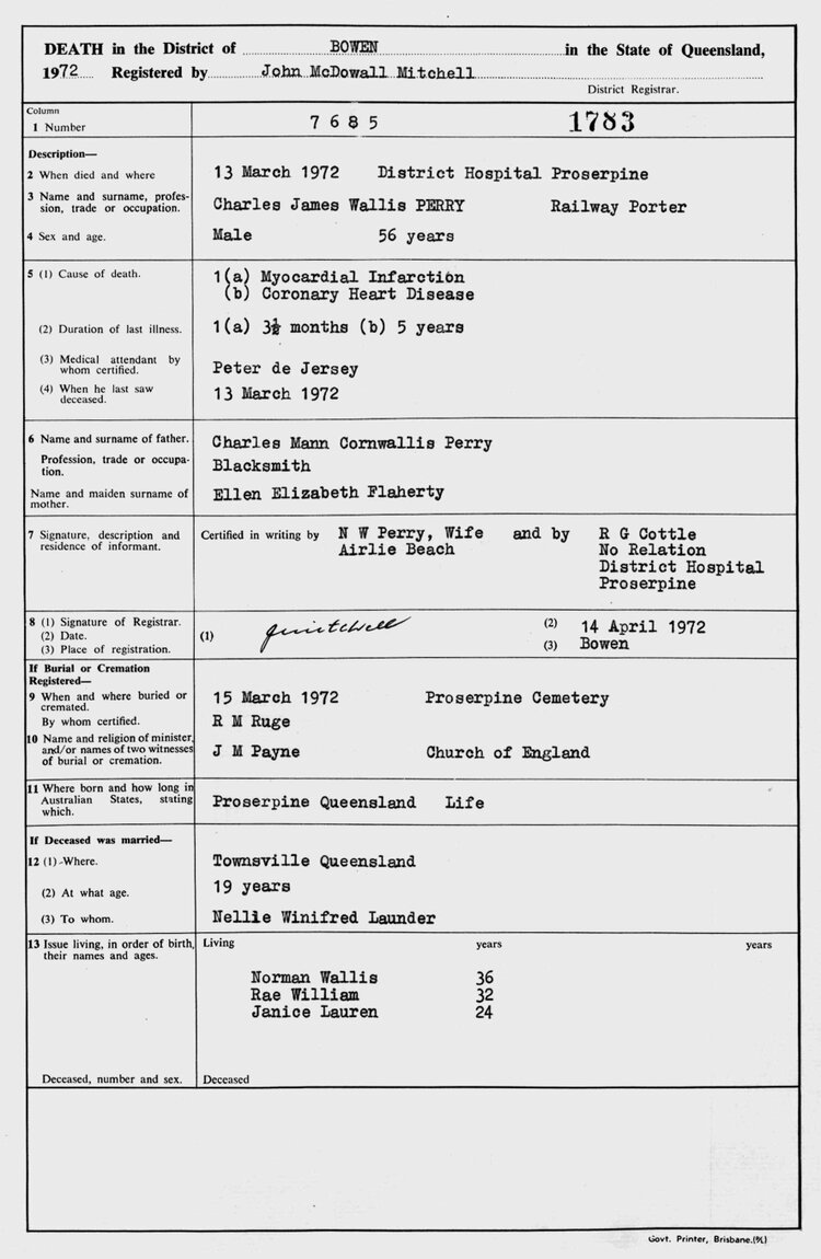 Birth 1915, June 20 at Proserpine, QueenslandFather Charles Mann Cornwallis Perry (Blacksmith)Mother Ellen Elizabeth FlahertyDeath 1972, March 13Age at Death 57 yearsBurial Proserpine Cemetery, Queensland
