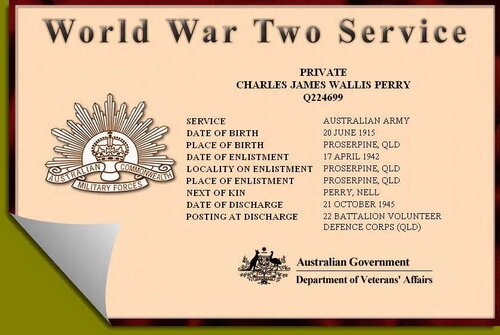 1942 - Charles James Wallis Perry - Enlistment in WW2Spouse Name: Charles James Wallis PerryMarriage Date: 14 Sep 1934Registration Place: QueenslandRegistration Year: 1934Ancestry.com. Australia, Marriage Index, 1788-1950