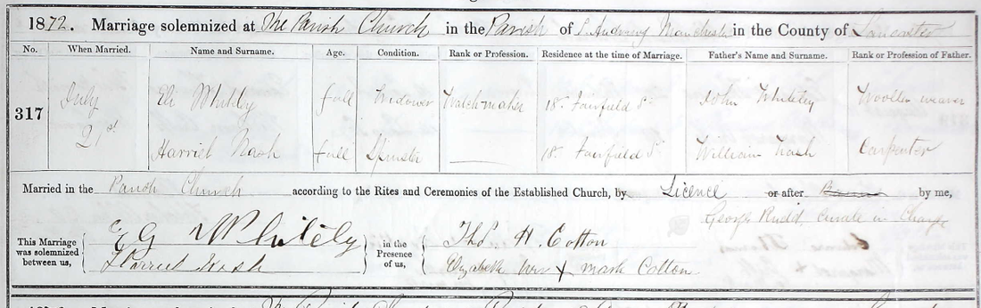 Born 1836, September 14 at Wheathampstead, HertfordshireBaptism 1837, January 22 at Wheathampstead, HertfordshireFather William NashMother Elizabeth SpikesleyMarriage 1872, July 21 at St. Andrew's Church, Lancashire, UKSpouse Ely Whiteley (Widower) (Watchmaker and Jeweller)