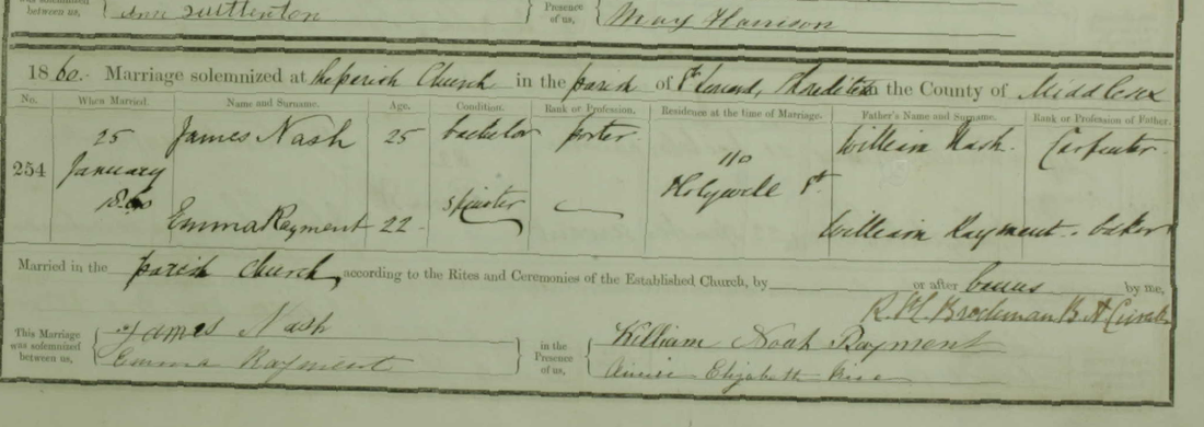 Born 1833, April 28 at Wheathampstead, HertfordshireBaptism 1833, August 25 at Wheathampstead, HertfordshireFather William NashMother Elizabeth SpikesleyMarriage #1 1860, January 25 at St. Leonard's, Shoreditch, LondonSpouse #1 Emma Rayment