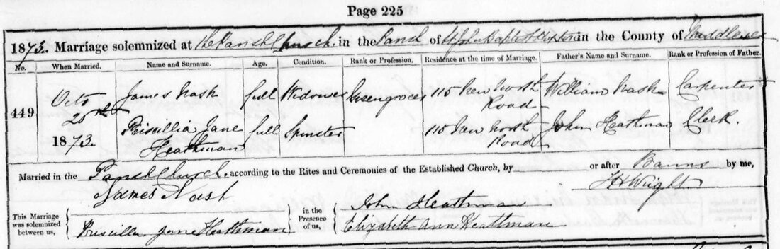Marriage #2 1873, October 25 at St John the Baptist, Horton, Middlesex, UKSpouse #2 Priscillia Jane Heathman
