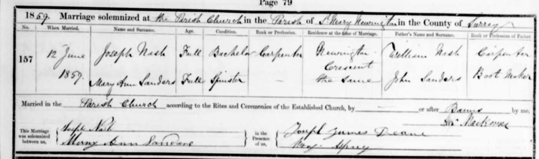 Born 1830, July 15 at Wheathampstead, HertfordshireBaptism 1830, September 12 at Wheathampstead, HertfordshireFather William NashMother Elizabeth SpikesleyMarriage 1859, June 12 at St. Mary, Newington, Kennington Park Road, Southwark, UKSpouse Mary Ann Sanders